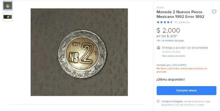 Algunas monedas de dos pesos mexicanos tendrían un valor mayor al que marca la misma. Estas podrían venderse desde los 500 hasta los 2 mil pesos en algunos sitios de compra y venta de artículos en Internet. Este es el caso de la moneda de dos pesos con un error en la fecha de acuñación, la cual es una de las monedas mexicanas más emblemáticas de la historia.